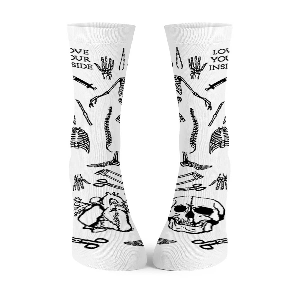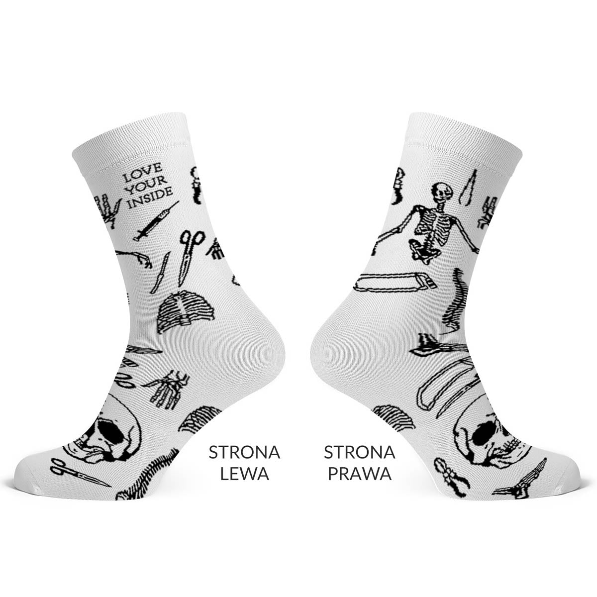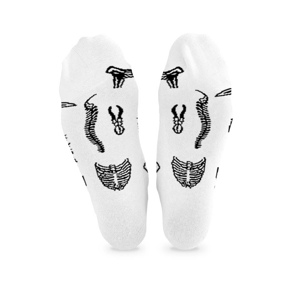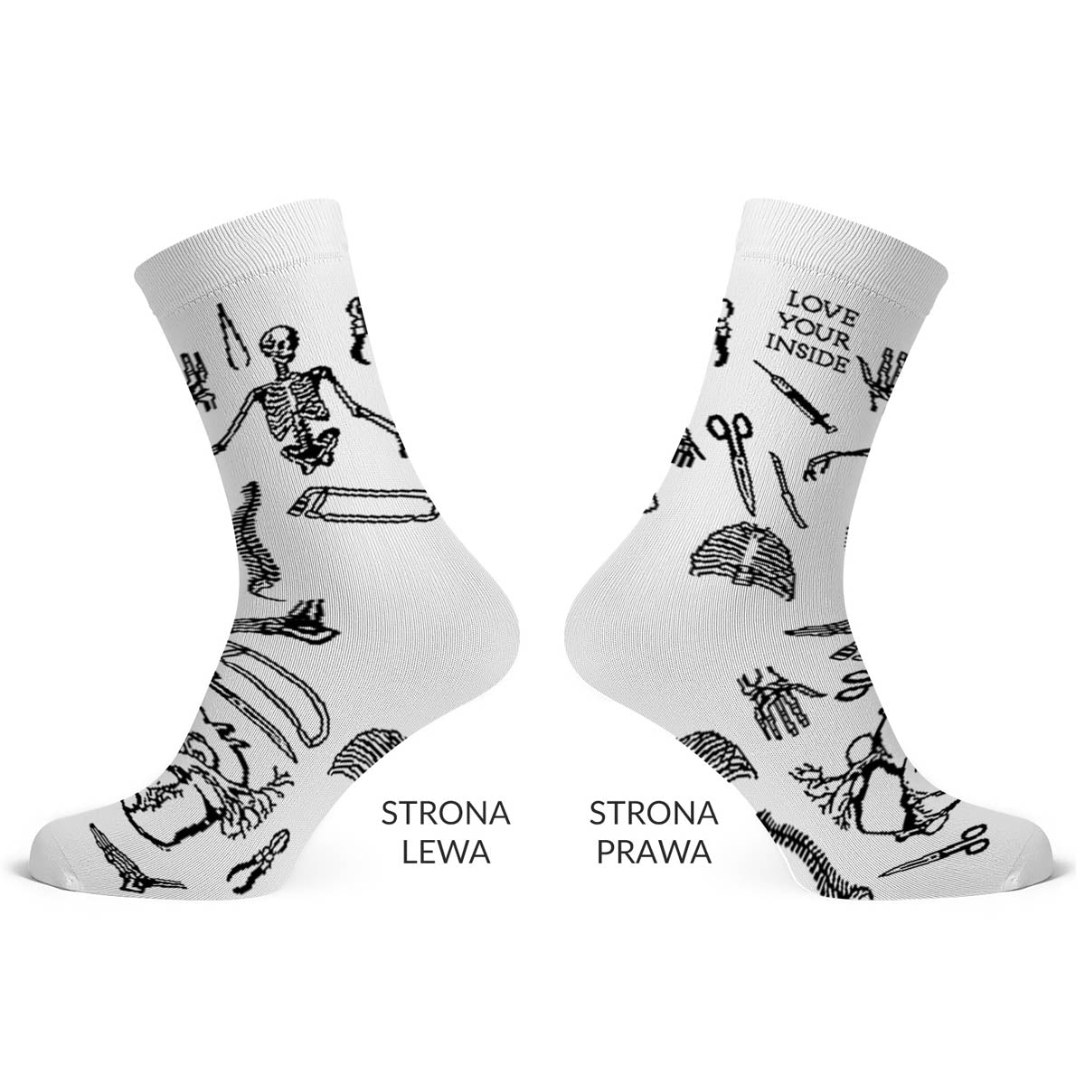 Długie skarpety z nadrukiem dla tych, którzy chcą anatomiczną estetykę na białej skarpetce. Oryginalne skarpety z wzorem, który wygląda jak grawerowane ilustracje z podręcznika medycyny - tyle że owinięte wokół stopy. Sprawdzą się jako skarpety na halloween i przez resztę roku.