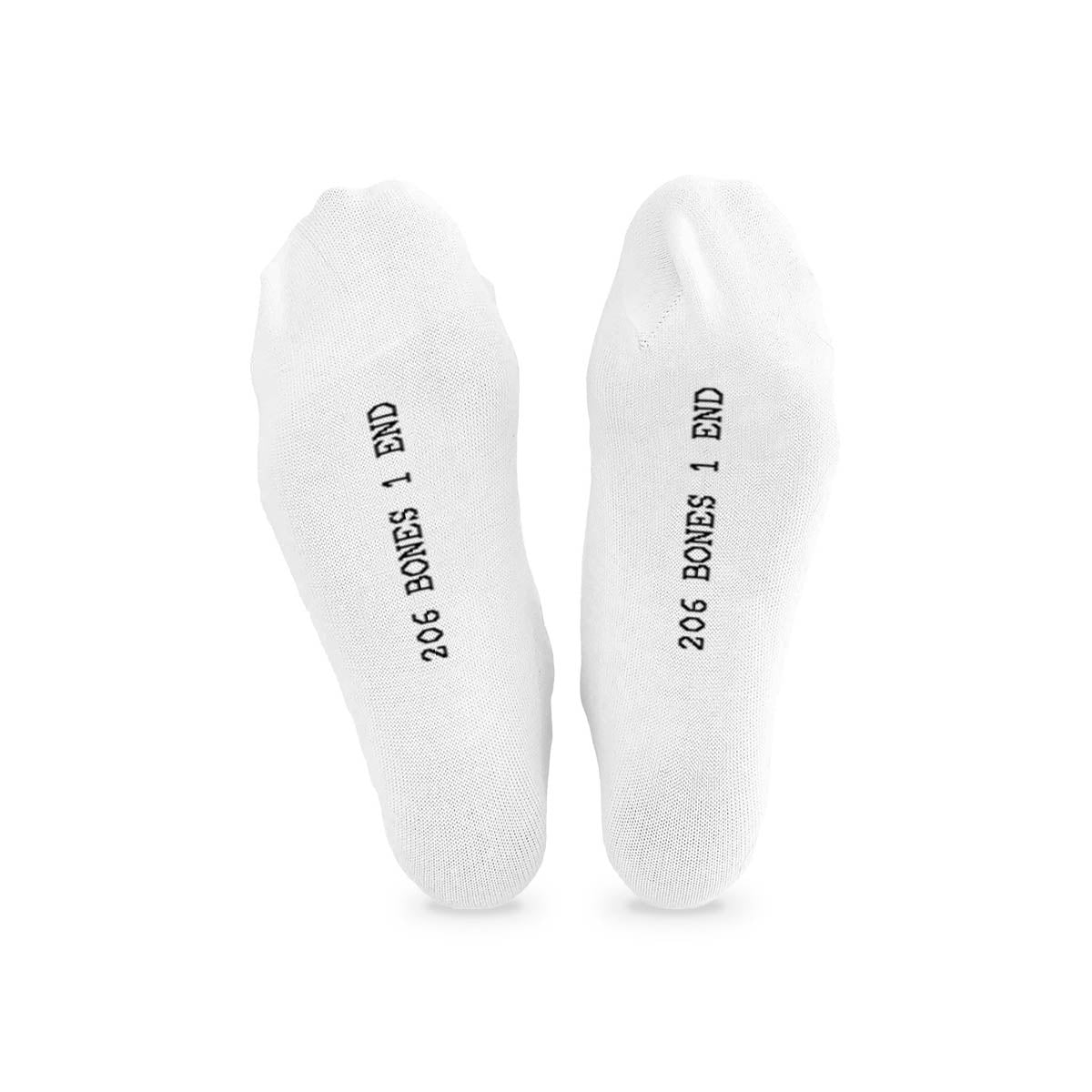 206 kości. Tyle dokładnie ma dorosły człowiek. Na tych skarpetach znajdziesz te, które trzymają cię w pionie - od paliczków po piętę, odwzorowane z chirurgiczną dokładnością na białej bawełnie.