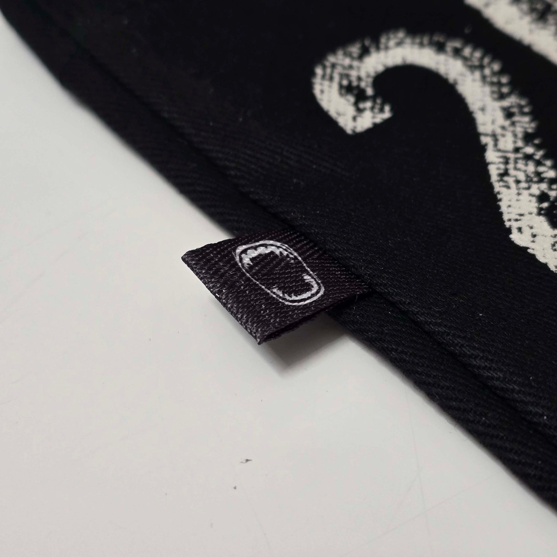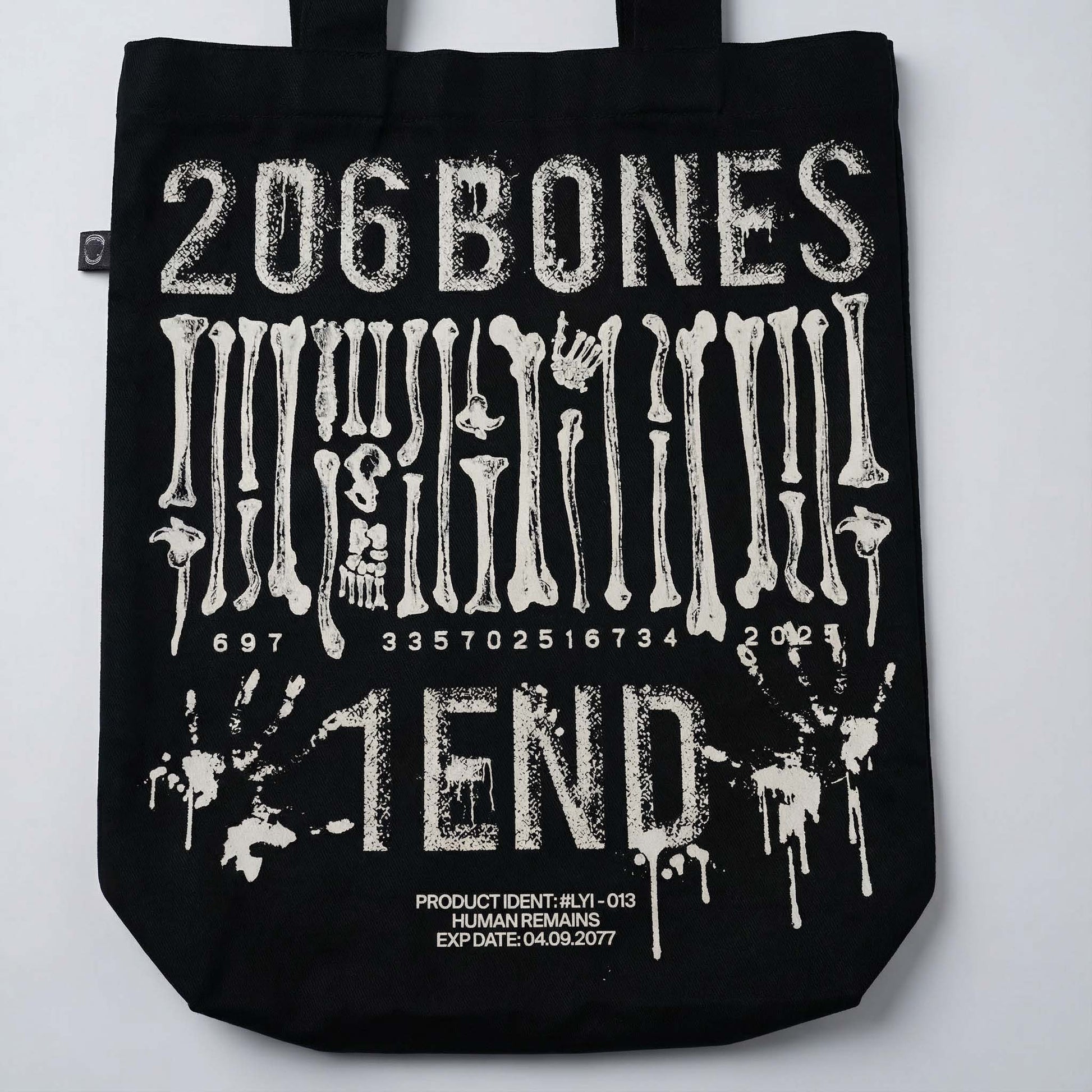 Czarna torba bawełniana z nadrukiem kodu kreskowego ułożonego z ludzkich kości. Projekt oparty na faktach anatomicznych i języku ewidencji.